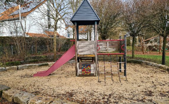 Schöner Spielplatz mit großem Kletternetz und Rutschturm für kleiner Kinder. Lage: Härtsfeldstrasse 80; 73432 Aalen Waldhausen