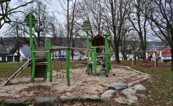 großer, sehr schön gelegener weitläufiger Spielplatzgroße Rutsche, Schaukeln, kleines Kletterhaus, Sandkasten, Karusell, Wippen Standort: Spielpaltz Jahnstraße, Walkstraße 44, 73431 Aalen
